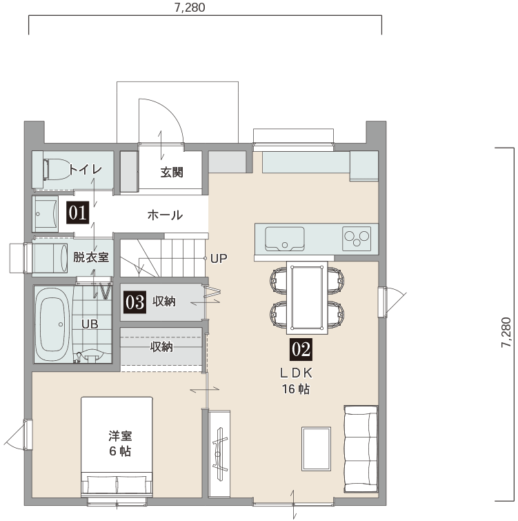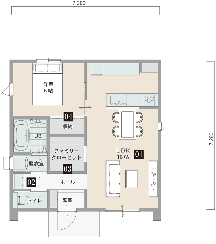 コンパクトサイズの平屋ですが、LDKはしっかり広さを確保した16帖。ゆったりとくつろげます。
