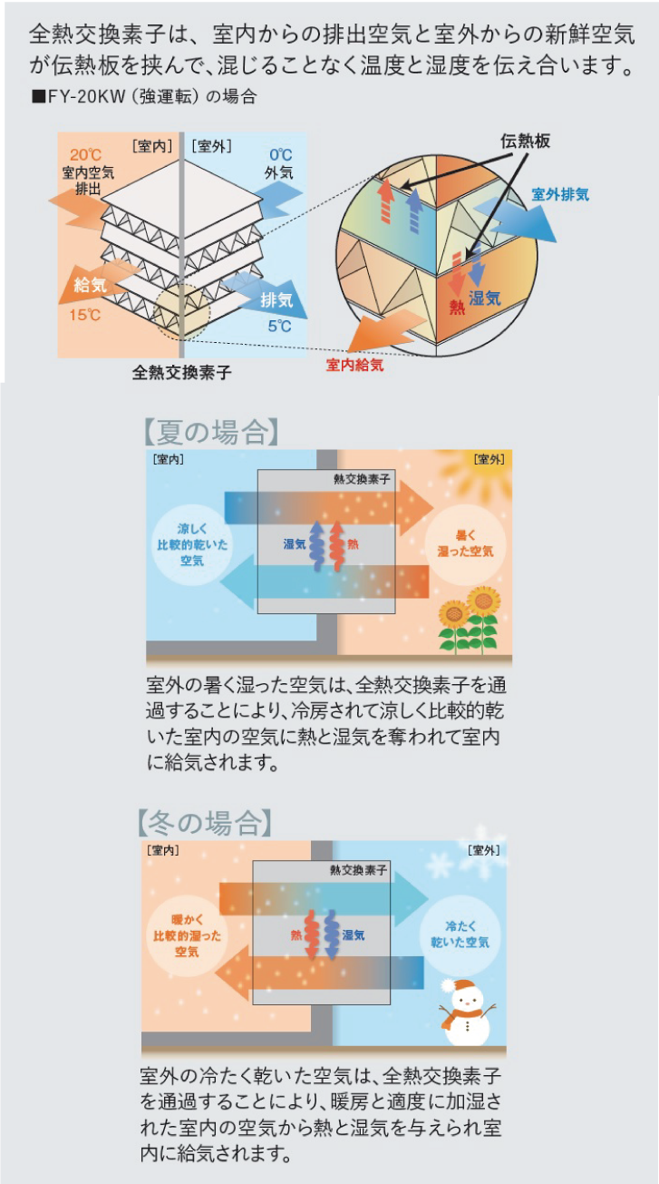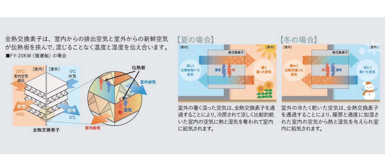 室内換気は、外気の空気を取り込んで行います。その際に生じる温度差を、熱交換して限りなく室内温度に近づけて換気をしていますので冷暖房のロスが少なく省エネ性に優れています。